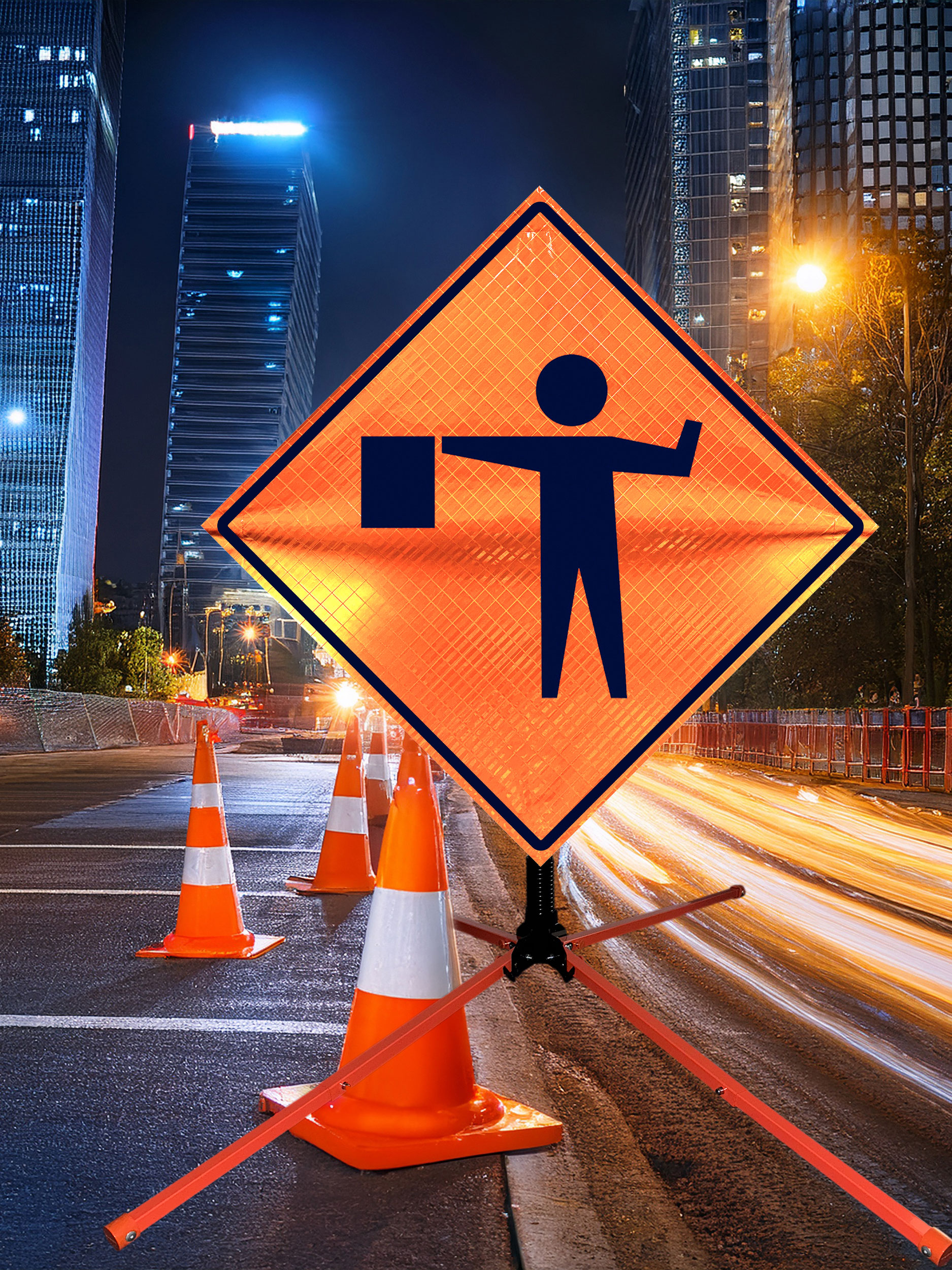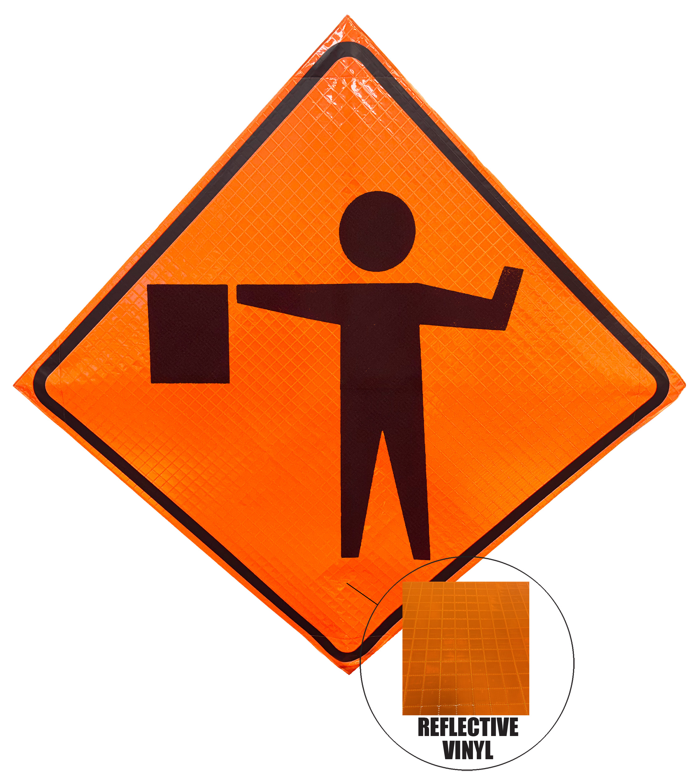 The OrangeGear® Flagger Symbol Roll-Up Sign & Stand Kit includes a 36" or 48" roll-up mesh or reflective vinyl safety sign, a four-legged steel or aluminum springless or single spring steel stand, and a pair of orange fiberglass cross ribs. The mesh signs are crafted from a robust, highly visible 15oz fluorescent safety orange woven mesh, while the reflective signs are made from ASTM certified, 3M™ high intensity reflective vinyl. Both signs feature a legend that complies with MUTCD standards, ensuring visibility for both road users and pedestrians. Each sign is equipped with durable sewn-on mesh corner pockets designed to accommodate the provided cross ribs. The stands are lightweight and can be folded for convenient storage and transport. The stand is equipped with a universal screw-lock bracket designed to securely hold signs featuring either sewn or plastic corner pockets. The single spring stand contains a robust steel spring enhancing its stability by allowing the sign to sway in windy conditions. The springless stands are compatible with mesh roll-up signs measuring 36 inches and 48 inches, while the single spring stand is compatible with both mesh and vinyl roll-up signs measuring 36 inches and 48 inches. All the stands elevate the signs 12 inches above the ground for optimal display. A kick release lever enables the adjustment of each leg to stabilize the stand on uneven surfaces. Each leg can extend up to 41" and is topped with bright orange riveted caps for enhanced visibility. The stand's dimensions are 41" x 26.75" when extended, while it folds down to a compact size of 5" W x 24" H, weighing 13 lbs. for the springless aluminum, 18 lbs. for the springless steel, and 25 lbs. for the single spring steel. All the stands are MASH approved, with the signs meeting MUTCD compliance.
