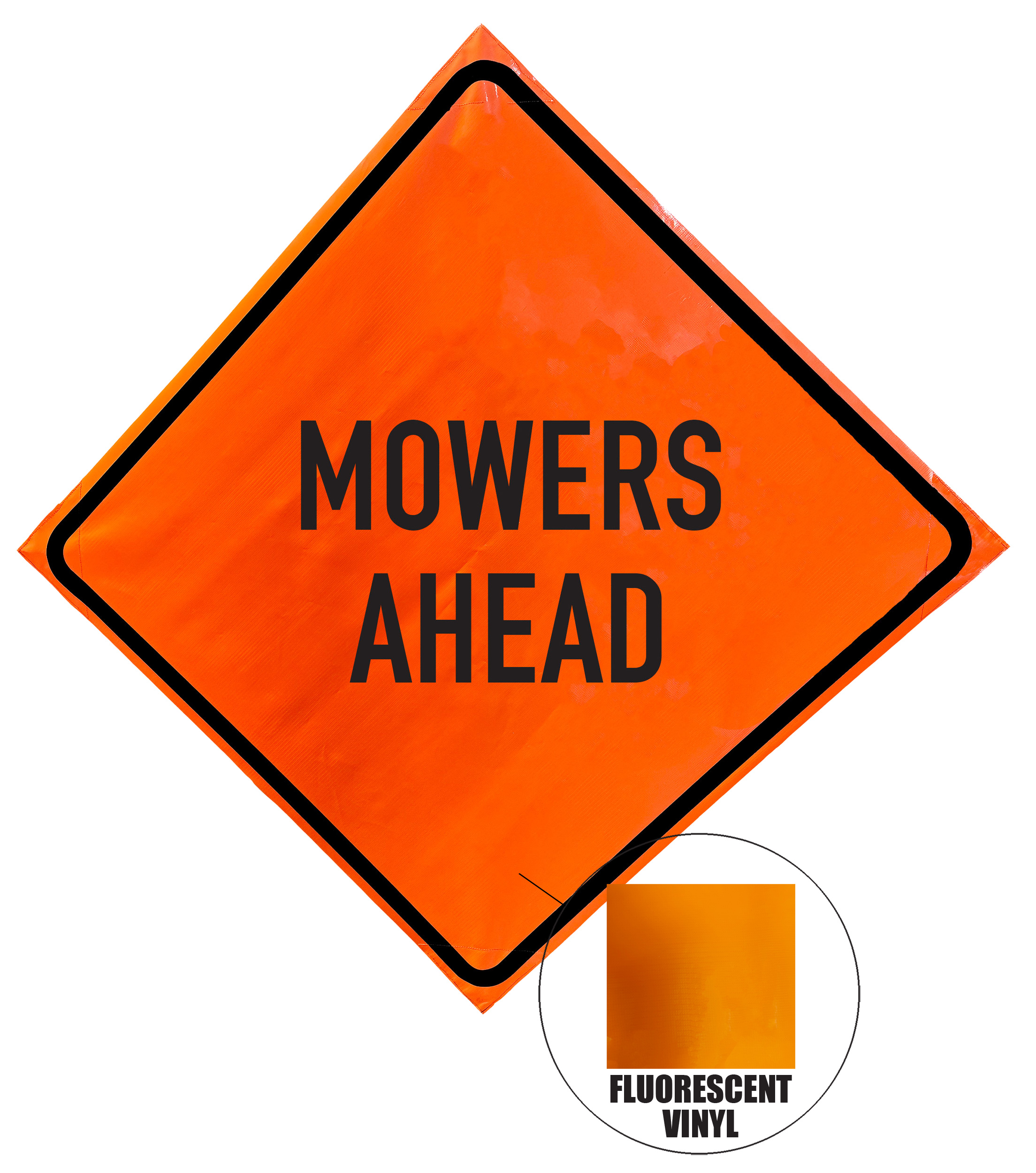 The OrangeGear® Mowers Ahead Roll-Up Sign & Stand Kit includes a 36" or 48" roll-up mesh, non-reflective vinyl or reflective vinyl safety sign, a four-legged steel or aluminum springless or single spring steel stand, and a pair of orange fiberglass cross ribs. The mesh signs are crafted from a robust, highly visible 15oz fluorescent safety orange woven mesh, the non-reflective vinyl signs are made of a highly visibe fluorescent orange vinyl, and the reflective signs are made from ASTM certified, 3M™ high intensity reflective vinyl. All 3 signs feature a legend that complies with MUTCD standards, ensuring visibility for both road users and pedestrians. Each sign is equipped with durable sewn-on corner pockets designed to accommodate the provided cross ribs, and a roll-up strap to help keep the sign securely rolled up when not in use. Both the non-reflective and reflective vinyl signs come with an anti-kiting strap on the back of the sign which attaches to the signs ribs to prevent the sign from lifting, flapping or "kiting" in the wind. The stands are lightweight and can be folded for convenient storage and transport. The stand is equipped with a universal screw-lock bracket designed to securely hold signs featuring either sewn or plastic corner pockets. The single spring stand contains a robust steel spring enhancing its stability by allowing the sign to sway in windy conditions. The springless stands are compatible with mesh roll-up signs measuring 36 inches and 48 inches, while the single spring stand is compatible with both mesh and vinyl roll-up signs measuring 36 inches and 48 inches. All the stands elevate the signs 12 inches above the ground for optimal display. A kick release lever enables the adjustment of each leg to stabilize the stand on uneven surfaces. Each leg can extend up to 41" and is topped with bright orange riveted caps for enhanced visibility. The stand's dimensions are 41" x 26.75" when extended, while it folds down to a compact size of 5" W x 24" H, weighing 13 lbs. for the springless aluminum, 18 lbs. for the springless steel, and 25 lbs. for the single spring steel. All the stands are MASH approved, with the signs meeting MUTCD compliance.