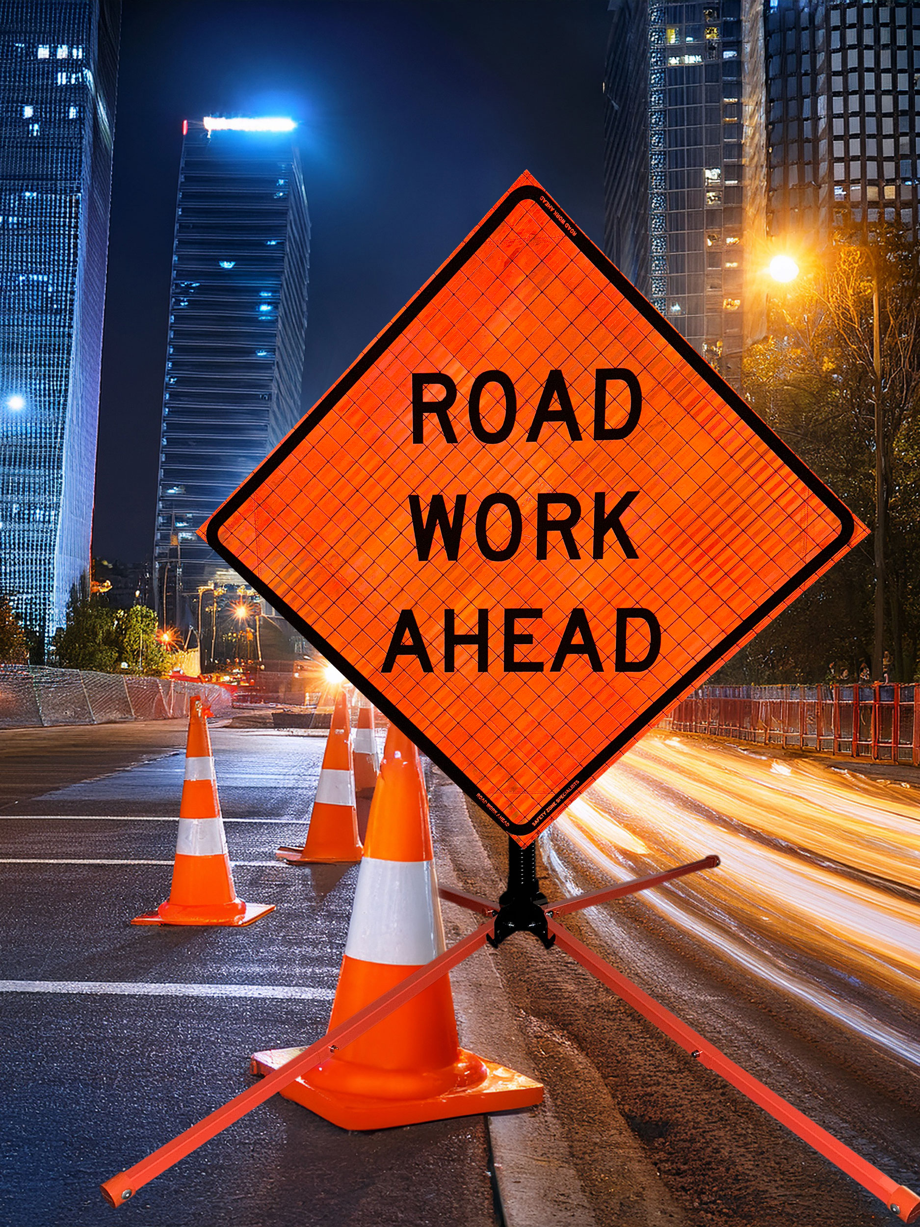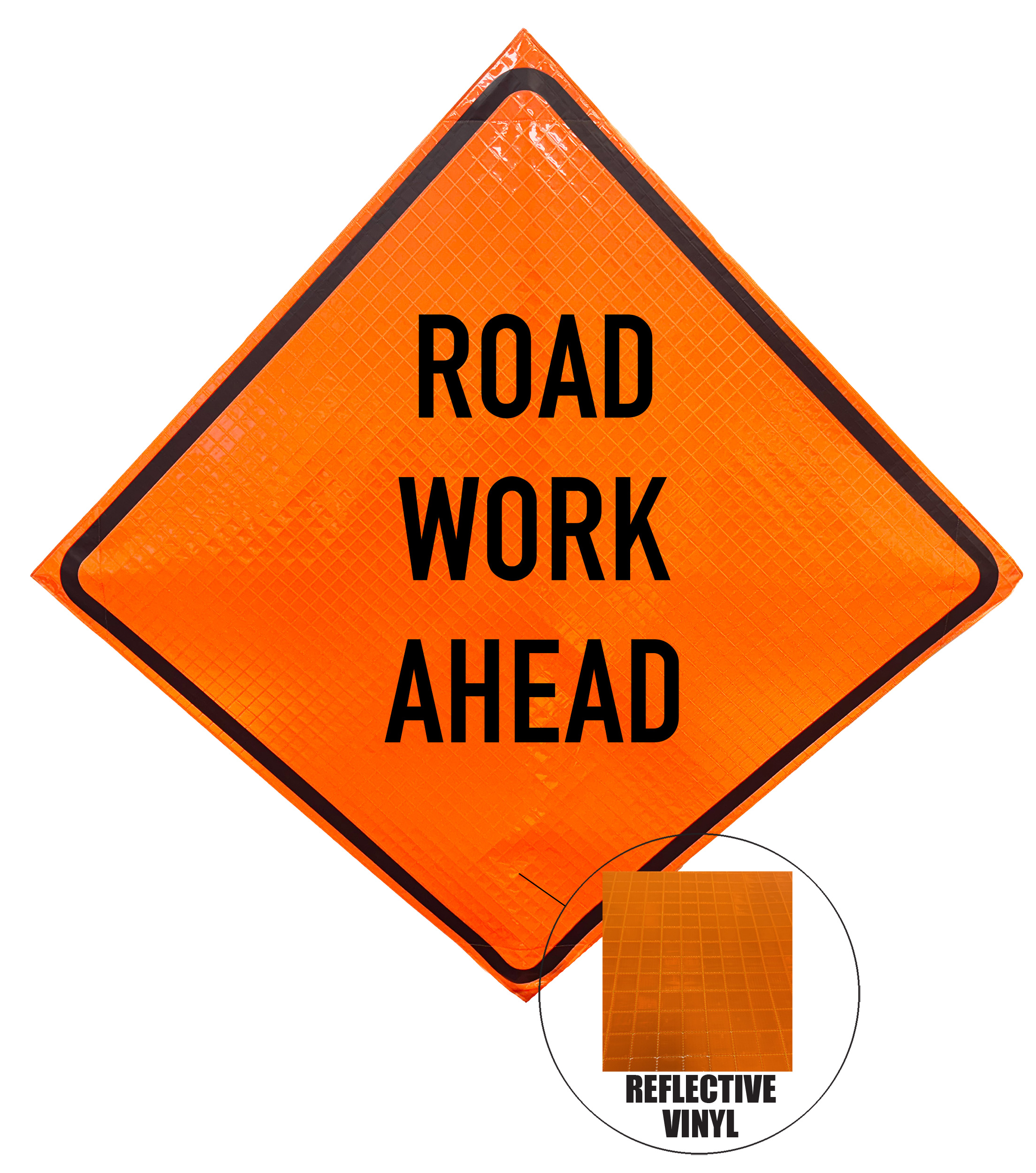 The OrangeGear® Road Work Ahead Roll-Up Sign & Stand Kit includes a 36" or 48" roll-up mesh or reflective vinyl safety sign, a four-legged steel or aluminum springless or single spring steel stand, and a pair of orange fiberglass cross ribs. The mesh signs are crafted from a robust, highly visible 15oz fluorescent safety orange woven mesh, while the reflective signs are made from ASTM certified, 3M™ high intensity reflective vinyl. Both signs feature a legend that complies with MUTCD standards, ensuring visibility for both road users and pedestrians. Each sign is equipped with durable sewn-on mesh corner pockets designed to accommodate the provided cross ribs. The stands are lightweight and can be folded for convenient storage and transport. The stand is equipped with a universal screw-lock bracket designed to securely hold signs featuring either sewn or plastic corner pockets. The single spring stand contains a robust steel spring enhancing its stability by allowing the sign to sway in windy conditions. The springless stands are compatible with mesh roll-up signs measuring 36 inches and 48 inches, while the single spring stand is compatible with both mesh and vinyl roll-up signs measuring 36 inches and 48 inches. All the stands elevate the signs 12 inches above the ground for optimal display. A kick release lever enables the adjustment of each leg to stabilize the stand on uneven surfaces. Each leg can extend up to 41" and is topped with bright orange riveted caps for enhanced visibility. The stand's dimensions are 41" x 26.75" when extended, while it folds down to a compact size of 5" W x 24" H, weighing 13 lbs. for the springless aluminum, 18 lbs. for the springless steel, and 25 lbs. for the single spring steel. All the stands are MASH approved, with the signs meeting MUTCD compliance.