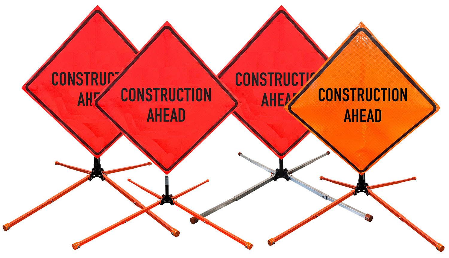 The OrangeGear® Construction Ahead Roll-Up Sign & Stand Kit includes a 36" or 48" roll-up mesh or reflective vinyl safety sign, a four-legged steel or aluminum springless or single spring steel stand, and a pair of orange fiberglass cross ribs. The mesh signs are crafted from a robust, highly visible 15oz fluorescent safety orange woven mesh, while the reflective signs are made from ASTM certified, 3M™ high intensity reflective vinyl. Both signs feature a legend that complies with MUTCD standards, ensuring visibility for both road users and pedestrians. Each sign is equipped with durable sewn-on mesh corner pockets designed to accommodate the provided cross ribs. The stands are lightweight and can be folded for convenient storage and transport. The stand is equipped with a universal screw-lock bracket designed to securely hold signs featuring either sewn or plastic corner pockets. The single spring stand contains a robust steel spring enhancing its stability by allowing the sign to sway in windy conditions. The springless stands are compatible with mesh roll-up signs measuring 36 inches and 48 inches, while the single spring stand is compatible with both mesh and vinyl roll-up signs measuring 36 inches and 48 inches. All the stands elevate the signs 12 inches above the ground for optimal display. A kick release lever enables the adjustment of each leg to stabilize the stand on uneven surfaces. Each leg can extend up to 41" and is topped with bright orange riveted caps for enhanced visibility. The stand's dimensions are 41" x 26.75" when extended, while it folds down to a compact size of 5" W x 24" H, weighing 13 lbs. for the springless aluminum, 18 lbs. for the springless steel, and 25 lbs. for the single spring steel. All the stands are MASH approved, with the signs meeting MUTCD compliance.