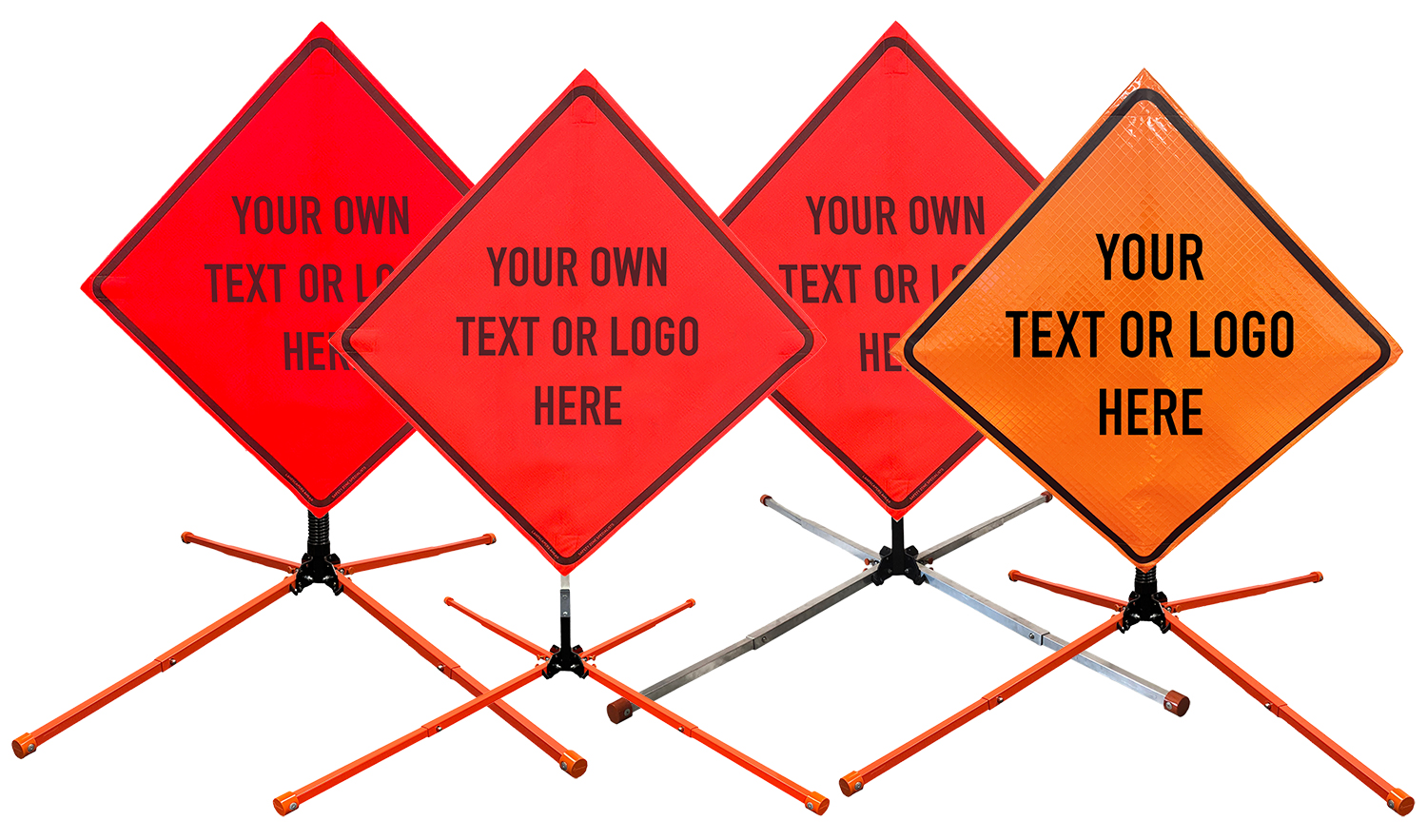 The OrangeGear® Custom Roll-Up Sign & Stand Kit includes a 36" or 48" roll-up mesh or reflective vinyl safety sign, a four-legged steel or aluminum springless or single spring steel stand, and a pair of orange fiberglass cross ribs. The mesh signs are crafted from a robust, highly visible 15oz fluorescent safety orange woven mesh, while the reflective signs are made from ASTM certified, 3M™ high intensity reflective vinyl. Both signs feature the custom artwork and/or text you supply in bold, black ink, ensuring visibility for both road users and pedestrians. Each sign is equipped with durable sewn-on mesh corner pockets designed to accommodate the provided cross ribs. The stands are lightweight and can be folded for convenient storage and transport. The stand is equipped with a universal screw-lock bracket designed to securely hold signs featuring either sewn or plastic corner pockets. The single spring stand contains a robust steel spring enhancing its stability by allowing the sign to sway in windy conditions. The springless stands are compatible with mesh roll-up signs measuring 36 inches and 48 inches, while the single spring stand is compatible with both mesh and vinyl roll-up signs measuring 36 inches and 48 inches. All the stands elevate the signs 12 inches above the ground for optimal display. A kick release lever enables the adjustment of each leg to stabilize the stand on uneven surfaces. Each leg can extend up to 41" and is topped with bright orange riveted caps for enhanced visibility. The stand's dimensions are 41" x 26.75" when extended, while it folds down to a compact size of 5" W x 24" H, weighing 13 lbs. for the springless aluminum, 18 lbs. for the springless steel, and 25 lbs. for the single spring steel. All the stands are MASH approved, with the signs meeting MUTCD compliance.