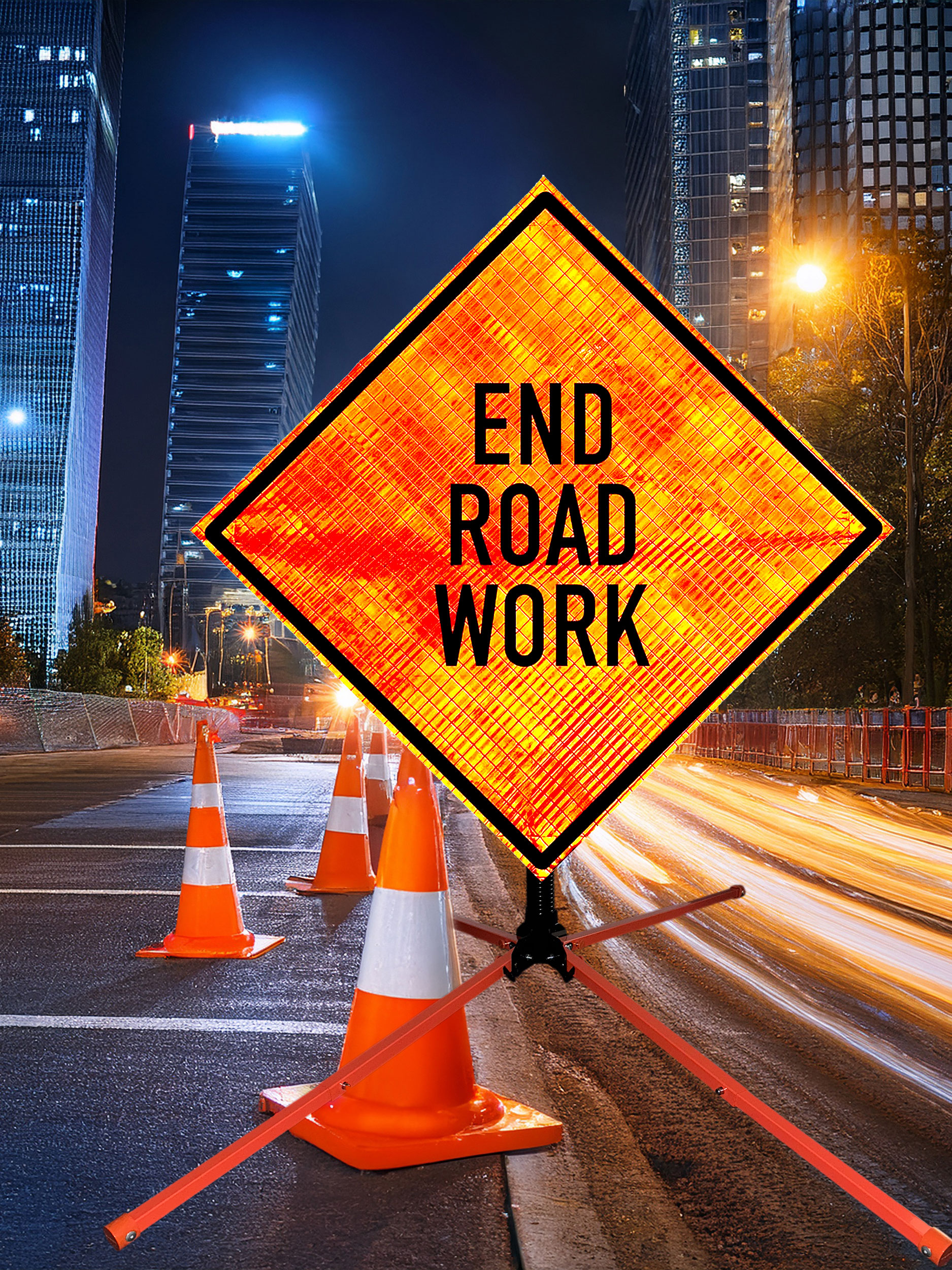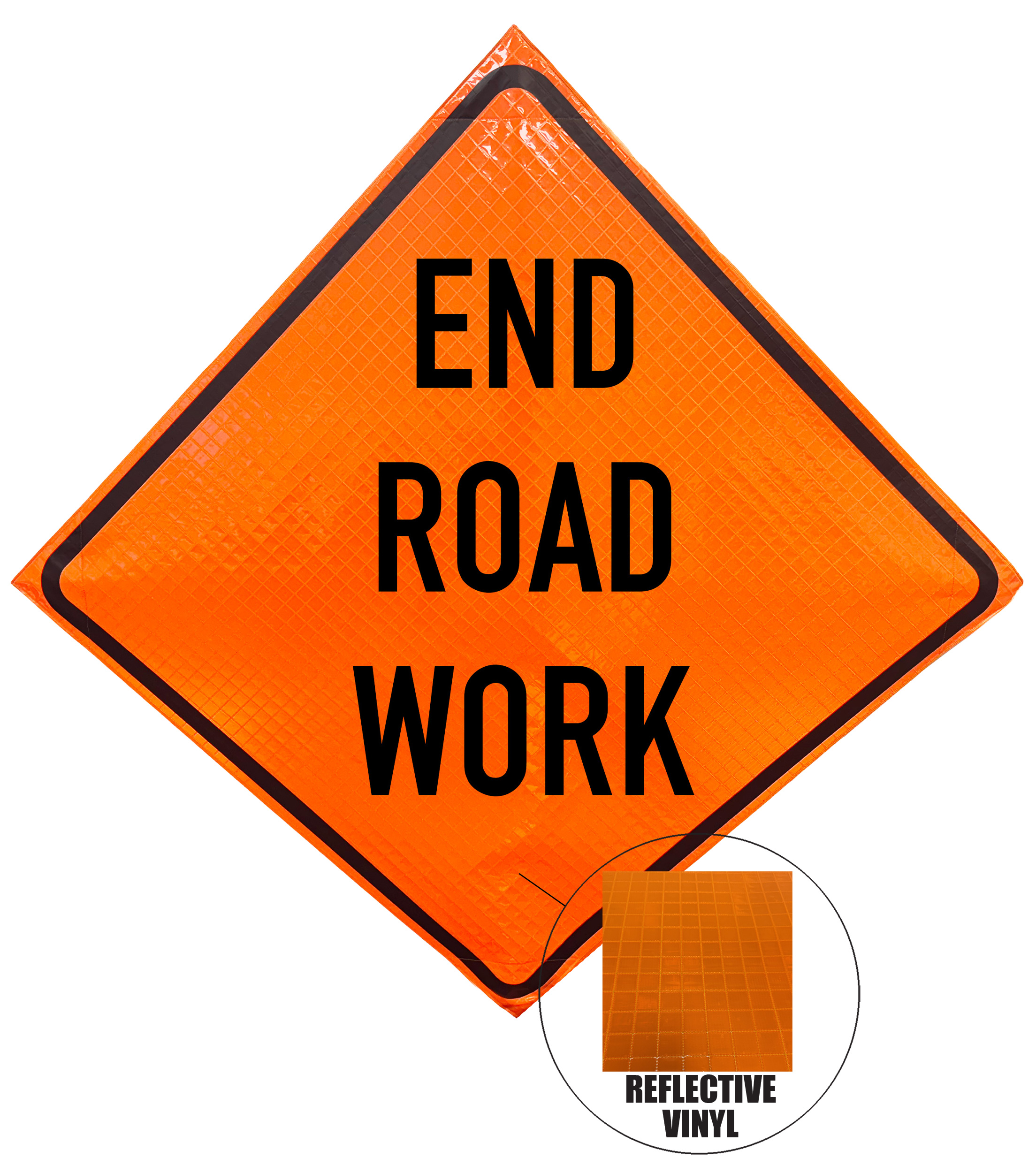 The OrangeGear® End Road Work Roll-Up Sign & Stand Kit includes a 36" or 48" roll-up mesh or reflective vinyl safety sign, a four-legged steel or aluminum springless or single spring steel stand, and a pair of orange fiberglass cross ribs. The mesh signs are crafted from a robust, highly visible 15oz fluorescent safety orange woven mesh, while the reflective signs are made from ASTM certified, 3M™ high intensity reflective vinyl. Both signs feature a legend that complies with MUTCD standards, ensuring visibility for both road users and pedestrians. Each sign is equipped with durable sewn-on mesh corner pockets designed to accommodate the provided cross ribs. The stands are lightweight and can be folded for convenient storage and transport. The stand is equipped with a universal screw-lock bracket designed to securely hold signs featuring either sewn or plastic corner pockets. The single spring stand contains a robust steel spring enhancing its stability by allowing the sign to sway in windy conditions. The springless stands are compatible with mesh roll-up signs measuring 36 inches and 48 inches, while the single spring stand is compatible with both mesh and vinyl roll-up signs measuring 36 inches and 48 inches. All the stands elevate the signs 12 inches above the ground for optimal display. A kick release lever enables the adjustment of each leg to stabilize the stand on uneven surfaces. Each leg can extend up to 41" and is topped with bright orange riveted caps for enhanced visibility. The stand's dimensions are 41" x 26.75" when extended, while it folds down to a compact size of 5" W x 24" H, weighing 13 lbs. for the springless aluminum, 18 lbs. for the springless steel, and 25 lbs. for the single spring steel. All the stands are MASH approved, with the signs meeting MUTCD compliance.