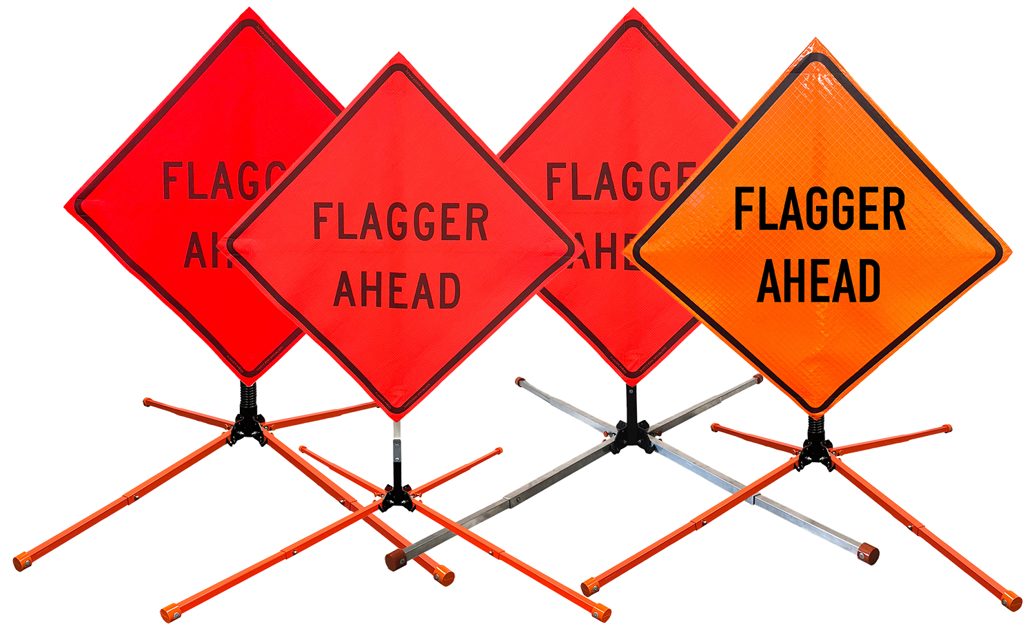 The OrangeGear® Flagger Ahead Roll-Up Sign & Stand Kit includes a 36" or 48" roll-up mesh or reflective vinyl safety sign, a four-legged steel or aluminum springless or single spring steel stand, and a pair of orange fiberglass cross ribs. The mesh signs are crafted from a robust, highly visible 15oz fluorescent safety orange woven mesh, while the reflective signs are made from ASTM certified, 3M™ high intensity reflective vinyl. Both signs feature a legend that complies with MUTCD standards, ensuring visibility for both road users and pedestrians. Each sign is equipped with durable sewn-on mesh corner pockets designed to accommodate the provided cross ribs. The stands are lightweight and can be folded for convenient storage and transport. The stand is equipped with a universal screw-lock bracket designed to securely hold signs featuring either sewn or plastic corner pockets. The single spring stand contains a robust steel spring enhancing its stability by allowing the sign to sway in windy conditions. The springless stands are compatible with mesh roll-up signs measuring 36 inches and 48 inches, while the single spring stand is compatible with both mesh and vinyl roll-up signs measuring 36 inches and 48 inches. All the stands elevate the signs 12 inches above the ground for optimal display. A kick release lever enables the adjustment of each leg to stabilize the stand on uneven surfaces. Each leg can extend up to 41" and is topped with bright orange riveted caps for enhanced visibility. The stand's dimensions are 41" x 26.75" when extended, while it folds down to a compact size of 5" W x 24" H, weighing 13 lbs. for the springless aluminum, 18 lbs. for the springless steel, and 25 lbs. for the single spring steel. All the stands are MASH approved, with the signs meeting MUTCD compliance.