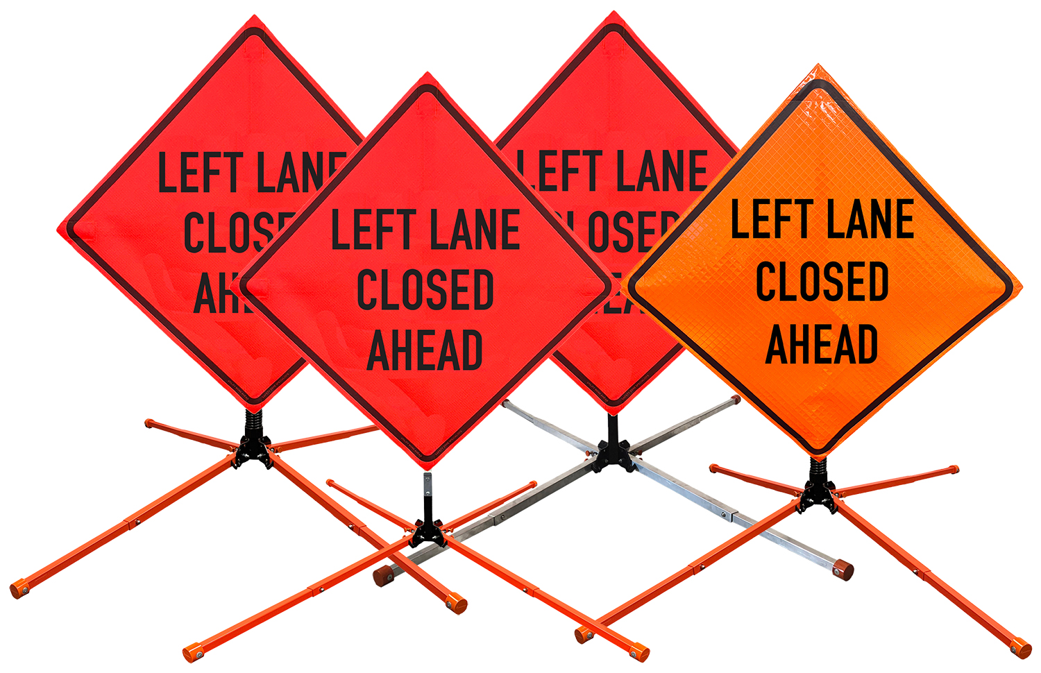 The OrangeGear® Left Lane Closed Ahead Roll-Up Sign & Stand Kit includes a 36" or 48" roll-up mesh or reflective vinyl safety sign, a four-legged steel or aluminum springless or single spring steel stand, and a pair of orange fiberglass cross ribs. The mesh signs are crafted from a robust, highly visible 15oz fluorescent safety orange woven mesh, while the reflective signs are made from ASTM certified, 3M™ high intensity reflective vinyl. Both signs feature a legend that complies with MUTCD standards, ensuring visibility for both road users and pedestrians. Each sign is equipped with durable sewn-on mesh corner pockets designed to accommodate the provided cross ribs. The stands are lightweight and can be folded for convenient storage and transport. The stand is equipped with a universal screw-lock bracket designed to securely hold signs featuring either sewn or plastic corner pockets. The single spring stand contains a robust steel spring enhancing its stability by allowing the sign to sway in windy conditions. The springless stands are compatible with mesh roll-up signs measuring 36 inches and 48 inches, while the single spring stand is compatible with both mesh and vinyl roll-up signs measuring 36 inches and 48 inches. All the stands elevate the signs 12 inches above the ground for optimal display. A kick release lever enables the adjustment of each leg to stabilize the stand on uneven surfaces. Each leg can extend up to 41" and is topped with bright orange riveted caps for enhanced visibility. The stand's dimensions are 41" x 26.75" when extended, while it folds down to a compact size of 5" W x 24" H, weighing 13 lbs. for the springless aluminum, 18 lbs. for the springless steel, and 25 lbs. for the single spring steel. All the stands are MASH approved, with the signs meeting MUTCD compliance.