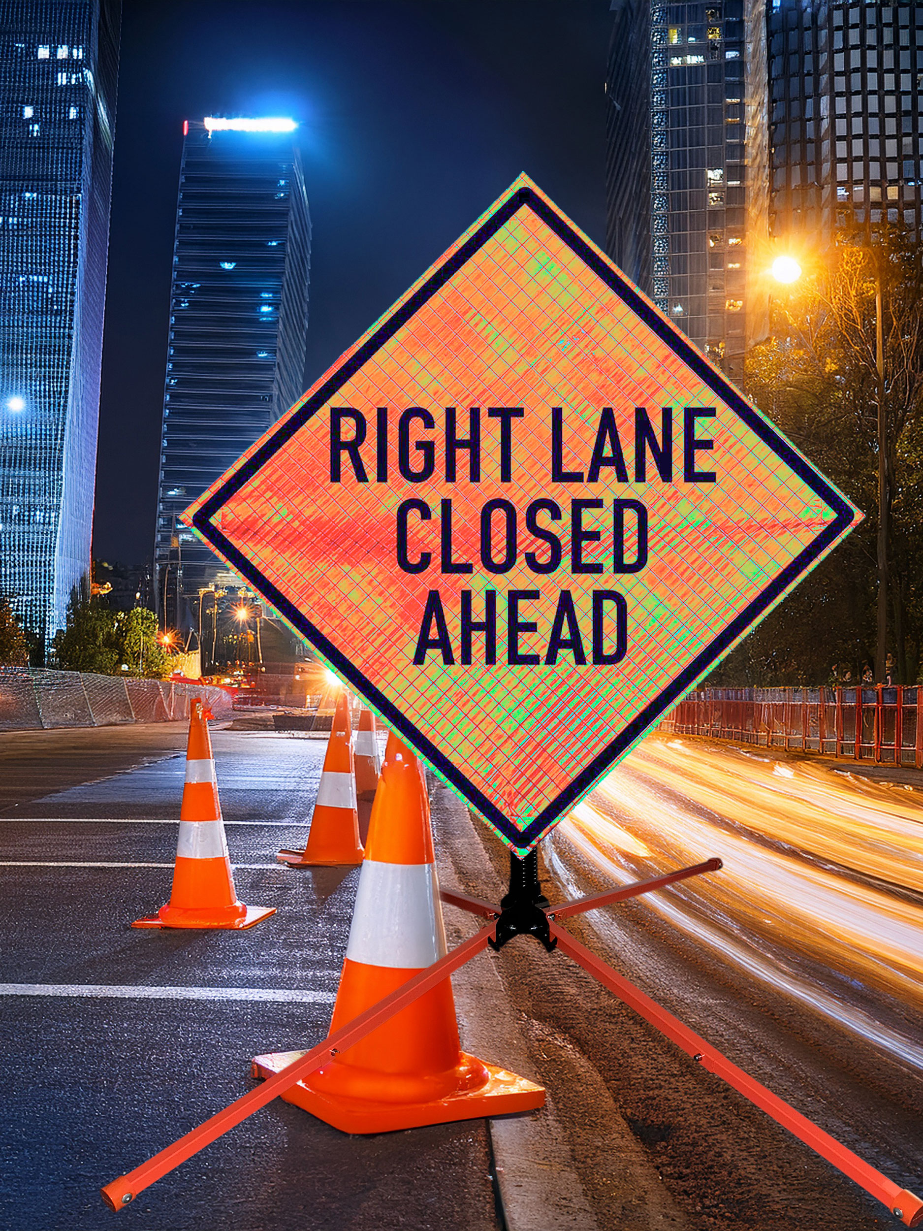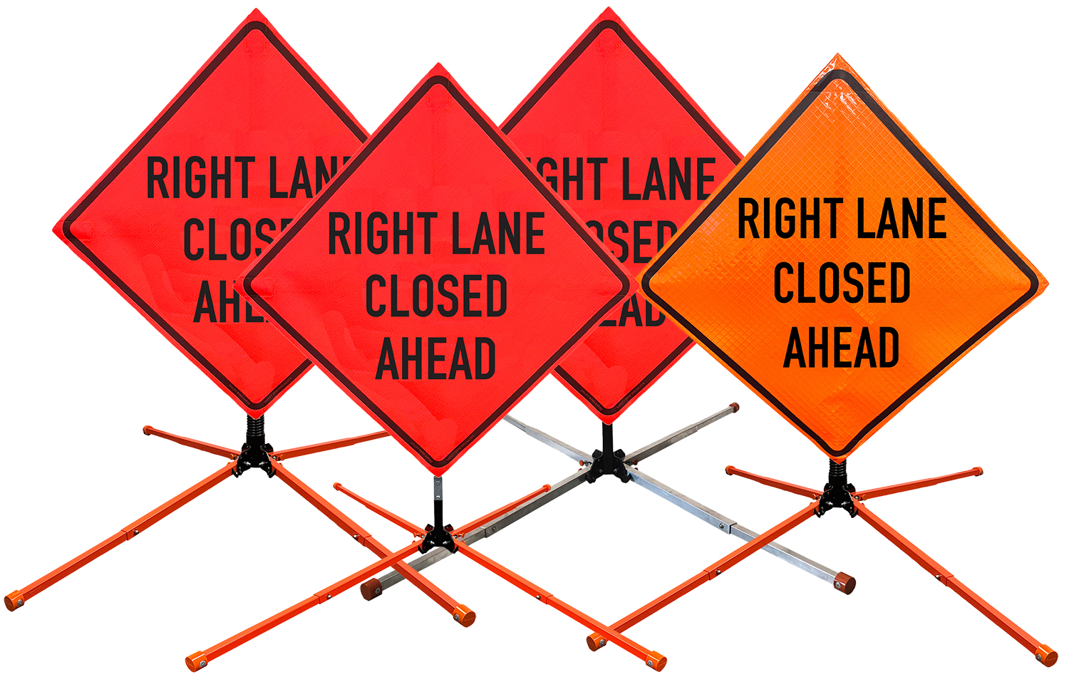 The OrangeGear® Right Lane Closed Ahead Roll-Up Sign & Stand Kit includes a 36" or 48" roll-up mesh or reflective vinyl safety sign, a four-legged steel or aluminum springless or single spring steel stand, and a pair of orange fiberglass cross ribs. The mesh signs are crafted from a robust, highly visible 15oz fluorescent safety orange woven mesh, while the reflective signs are made from ASTM certified, 3M™ high intensity reflective vinyl. Both signs feature a legend that complies with MUTCD standards, ensuring visibility for both road users and pedestrians. Each sign is equipped with durable sewn-on mesh corner pockets designed to accommodate the provided cross ribs. The stands are lightweight and can be folded for convenient storage and transport. The stand is equipped with a universal screw-lock bracket designed to securely hold signs featuring either sewn or plastic corner pockets. The single spring stand contains a robust steel spring enhancing its stability by allowing the sign to sway in windy conditions. The springless stands are compatible with mesh roll-up signs measuring 36 inches and 48 inches, while the single spring stand is compatible with both mesh and vinyl roll-up signs measuring 36 inches and 48 inches. All the stands elevate the signs 12 inches above the ground for optimal display. A kick release lever enables the adjustment of each leg to stabilize the stand on uneven surfaces. Each leg can extend up to 41" and is topped with bright orange riveted caps for enhanced visibility. The stand's dimensions are 41" x 26.75" when extended, while it folds down to a compact size of 5" W x 24" H, weighing 13 lbs. for the springless aluminum, 18 lbs. for the springless steel, and 25 lbs. for the single spring steel. All the stands are MASH approved, with the signs meeting MUTCD compliance.