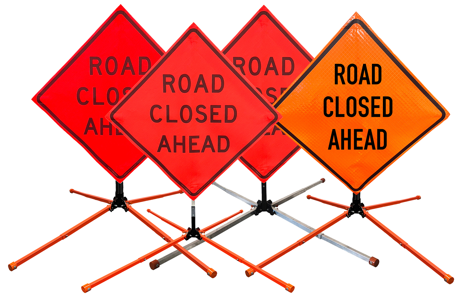 The OrangeGear® Road Closed Ahead Roll-Up Sign & Stand Kit includes a 36" or 48" roll-up mesh or reflective vinyl safety sign, a four-legged steel or aluminum springless or single spring steel stand, and a pair of orange fiberglass cross ribs. The mesh signs are crafted from a robust, highly visible 15oz fluorescent safety orange woven mesh, while the reflective signs are made from ASTM certified, 3M™ high intensity reflective vinyl. Both signs feature a legend that complies with MUTCD standards, ensuring visibility for both road users and pedestrians. Each sign is equipped with durable sewn-on mesh corner pockets designed to accommodate the provided cross ribs. The stands are lightweight and can be folded for convenient storage and transport. The stand is equipped with a universal screw-lock bracket designed to securely hold signs featuring either sewn or plastic corner pockets. The single spring stand contains a robust steel spring enhancing its stability by allowing the sign to sway in windy conditions. The springless stands are compatible with mesh roll-up signs measuring 36 inches and 48 inches, while the single spring stand is compatible with both mesh and vinyl roll-up signs measuring 36 inches and 48 inches. All the stands elevate the signs 12 inches above the ground for optimal display. A kick release lever enables the adjustment of each leg to stabilize the stand on uneven surfaces. Each leg can extend up to 41" and is topped with bright orange riveted caps for enhanced visibility. The stand's dimensions are 41" x 26.75" when extended, while it folds down to a compact size of 5" W x 24" H, weighing 13 lbs. for the springless aluminum, 18 lbs. for the springless steel, and 25 lbs. for the single spring steel. All the stands are MASH approved, with the signs meeting MUTCD compliance.