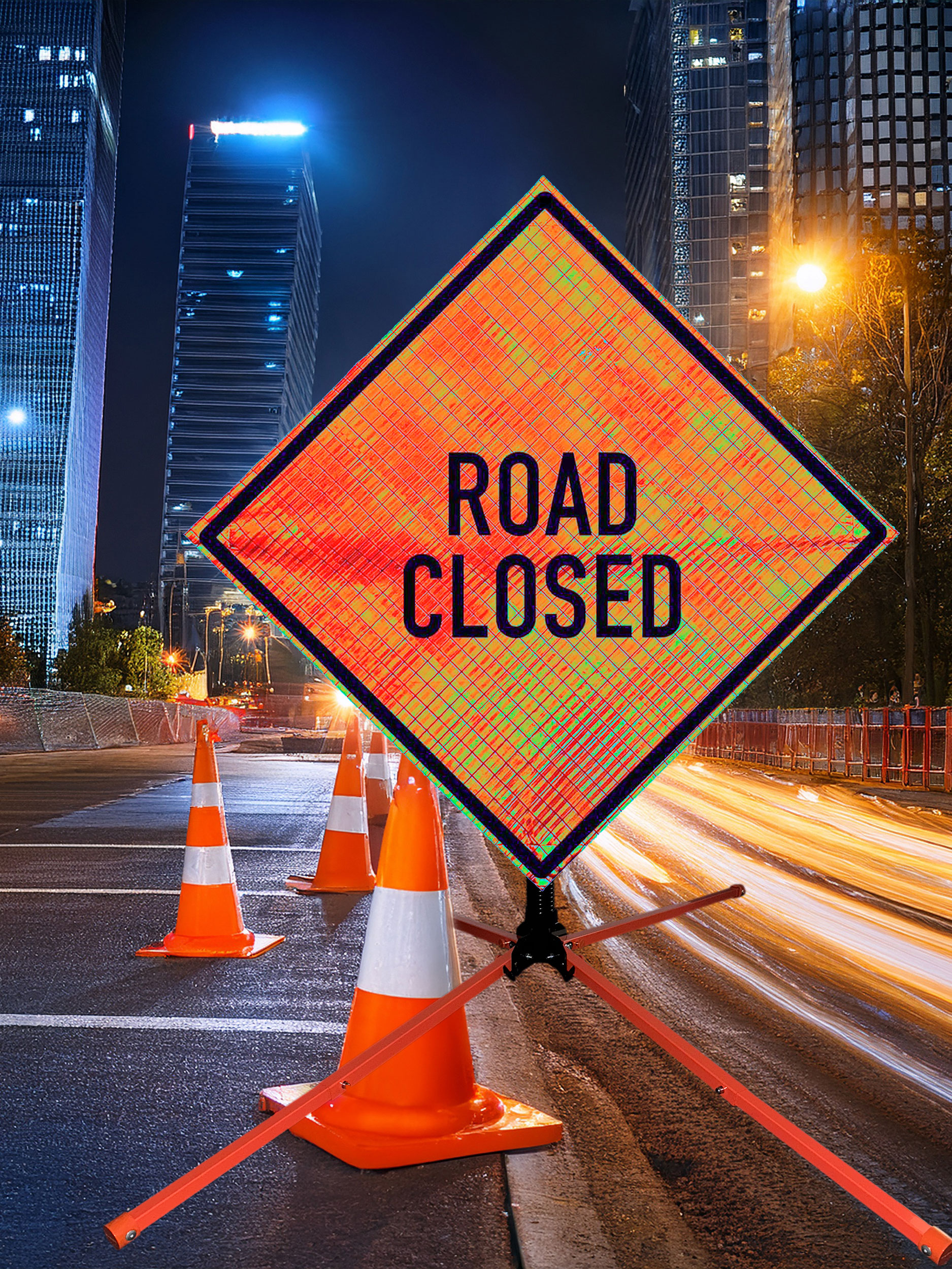 The OrangeGear® Road Closed Roll-Up Sign & Stand Kit includes a 36" or 48" roll-up mesh or reflective vinyl safety sign, a four-legged steel or aluminum springless or single spring steel stand, and a pair of orange fiberglass cross ribs. The mesh signs are crafted from a robust, highly visible 15oz fluorescent safety orange woven mesh, while the reflective signs are made from ASTM certified, 3M™ high intensity reflective vinyl. Both signs feature a legend that complies with MUTCD standards, ensuring visibility for both road users and pedestrians. Each sign is equipped with durable sewn-on mesh corner pockets designed to accommodate the provided cross ribs. The stands are lightweight and can be folded for convenient storage and transport. The stand is equipped with a universal screw-lock bracket designed to securely hold signs featuring either sewn or plastic corner pockets. The single spring stand contains a robust steel spring enhancing its stability by allowing the sign to sway in windy conditions. The springless stands are compatible with mesh roll-up signs measuring 36 inches and 48 inches, while the single spring stand is compatible with both mesh and vinyl roll-up signs measuring 36 inches and 48 inches. All the stands elevate the signs 12 inches above the ground for optimal display. A kick release lever enables the adjustment of each leg to stabilize the stand on uneven surfaces. Each leg can extend up to 41" and is topped with bright orange riveted caps for enhanced visibility. The stand's dimensions are 41" x 26.75" when extended, while it folds down to a compact size of 5" W x 24" H, weighing 13 lbs. for the springless aluminum, 18 lbs. for the springless steel, and 25 lbs. for the single spring steel. All the stands are MASH approved, with the signs meeting MUTCD compliance.