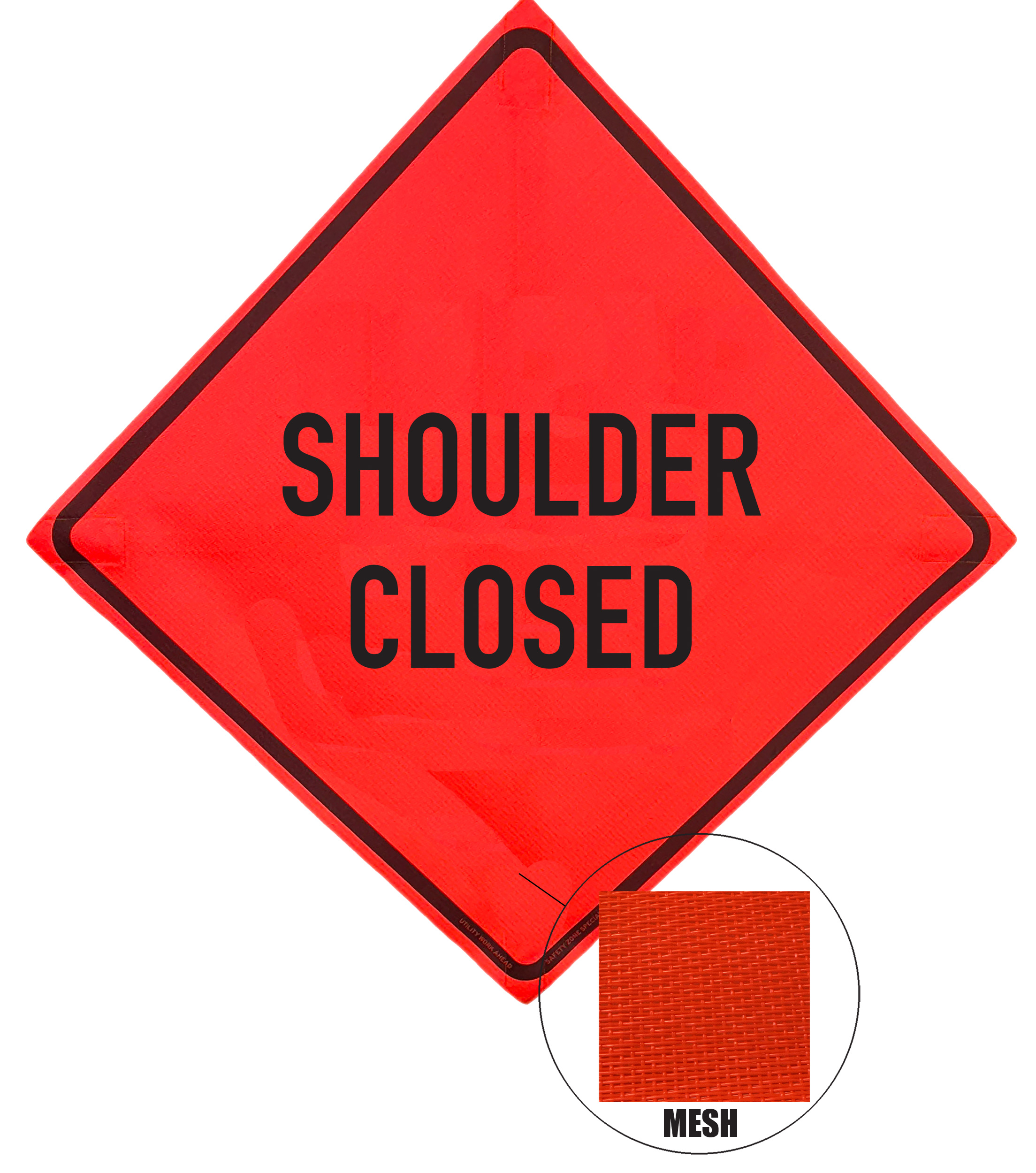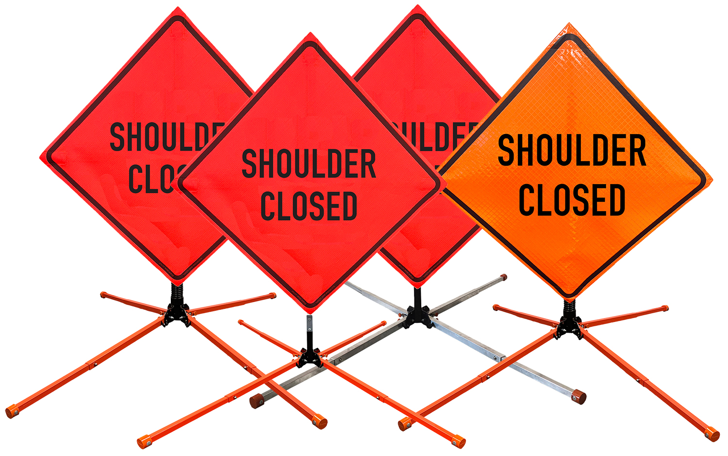 The OrangeGear® Shoulder Closed Roll-Up Sign & Stand Kit includes a 36" or 48" roll-up mesh or reflective vinyl safety sign, a four-legged steel or aluminum springless or single spring steel stand, and a pair of orange fiberglass cross ribs. The mesh signs are crafted from a robust, highly visible 15oz fluorescent safety orange woven mesh, while the reflective signs are made from ASTM certified, 3M™ high intensity reflective vinyl. Both signs feature a legend that complies with MUTCD standards, ensuring visibility for both road users and pedestrians. Each sign is equipped with durable sewn-on mesh corner pockets designed to accommodate the provided cross ribs. The stands are lightweight and can be folded for convenient storage and transport. The stand is equipped with a universal screw-lock bracket designed to securely hold signs featuring either sewn or plastic corner pockets. The single spring stand contains a robust steel spring enhancing its stability by allowing the sign to sway in windy conditions. The springless stands are compatible with mesh roll-up signs measuring 36 inches and 48 inches, while the single spring stand is compatible with both mesh and vinyl roll-up signs measuring 36 inches and 48 inches. All the stands elevate the signs 12 inches above the ground for optimal display. A kick release lever enables the adjustment of each leg to stabilize the stand on uneven surfaces. Each leg can extend up to 41" and is topped with bright orange riveted caps for enhanced visibility. The stand's dimensions are 41" x 26.75" when extended, while it folds down to a compact size of 5" W x 24" H, weighing 13 lbs. for the springless aluminum, 18 lbs. for the springless steel, and 25 lbs. for the single spring steel. All the stands are MASH approved, with the signs meeting MUTCD compliance.