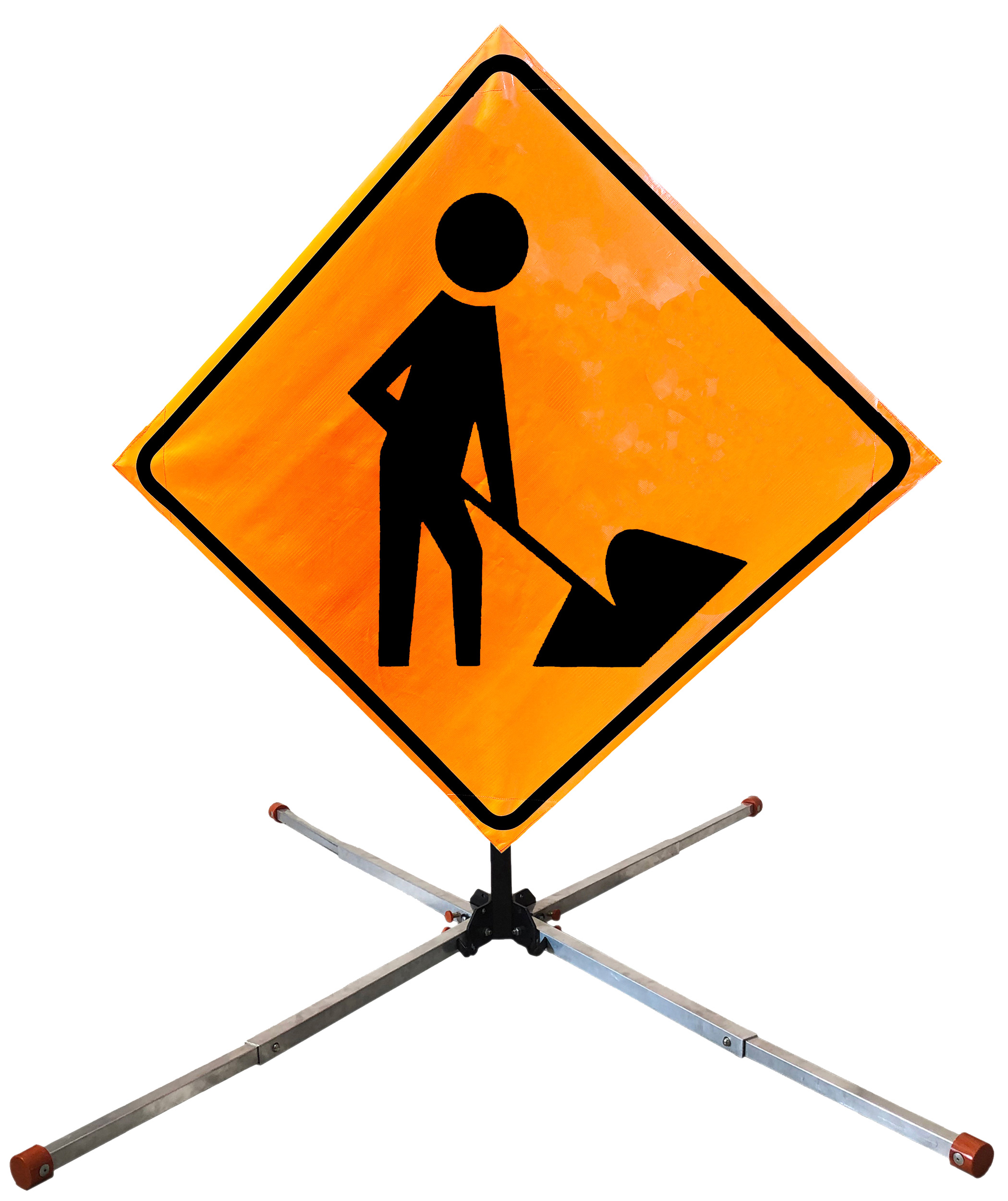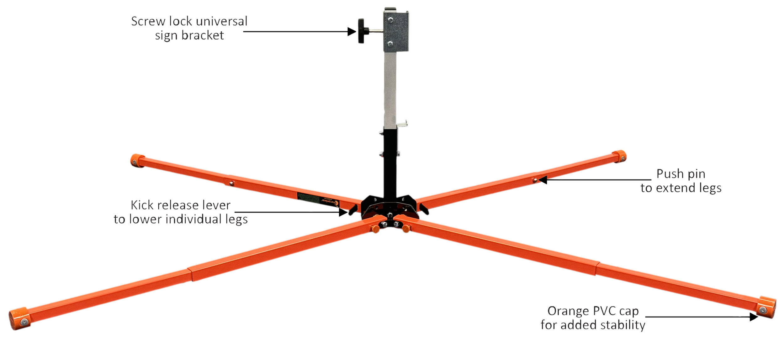 The OrangeGear® Worker Symbol Roll-Up Sign & Stand Kit includes a 36" or 48" roll-up mesh, non-reflective vinyl or reflective vinyl safety sign, a four-legged steel or aluminum springless or single spring steel stand, and a pair of orange fiberglass cross ribs. The mesh signs are crafted from a robust, highly visible 15oz fluorescent safety orange woven mesh, the non-reflective vinyl signs are made of a highly visibe fluorescent orange vinyl, and the reflective signs are made from ASTM certified, 3M™ high intensity reflective vinyl. All 3 signs feature a legend that complies with MUTCD standards, ensuring visibility for both road users and pedestrians. Each sign is equipped with durable sewn-on corner pockets designed to accommodate the provided cross ribs, and a roll-up strap to help keep the sign securely rolled up when not in use. Both the non-reflective and reflective vinyl signs come with an anti-kiting strap on the back of the sign which attaches to the signs ribs to prevent the sign from lifting, flapping or "kiting" in the wind. The stands are lightweight and can be folded for convenient storage and transport. The stand is equipped with a universal screw-lock bracket designed to securely hold signs featuring either sewn or plastic corner pockets. The single spring stand contains a robust steel spring enhancing its stability by allowing the sign to sway in windy conditions. The springless stands are compatible with mesh roll-up signs measuring 36 inches and 48 inches, while the single spring stand is compatible with both mesh and vinyl roll-up signs measuring 36 inches and 48 inches. All the stands elevate the signs 12 inches above the ground for optimal display. A kick release lever enables the adjustment of each leg to stabilize the stand on uneven surfaces. Each leg can extend up to 41" and is topped with bright orange riveted caps for enhanced visibility. The stand's dimensions are 41" x 26.75" when extended, while it folds down to a compact size of 5" W x 24" H, weighing 13 lbs. for the springless aluminum, 18 lbs. for the springless steel, and 25 lbs. for the single spring steel. All the stands are MASH approved, with the signs meeting MUTCD compliance.