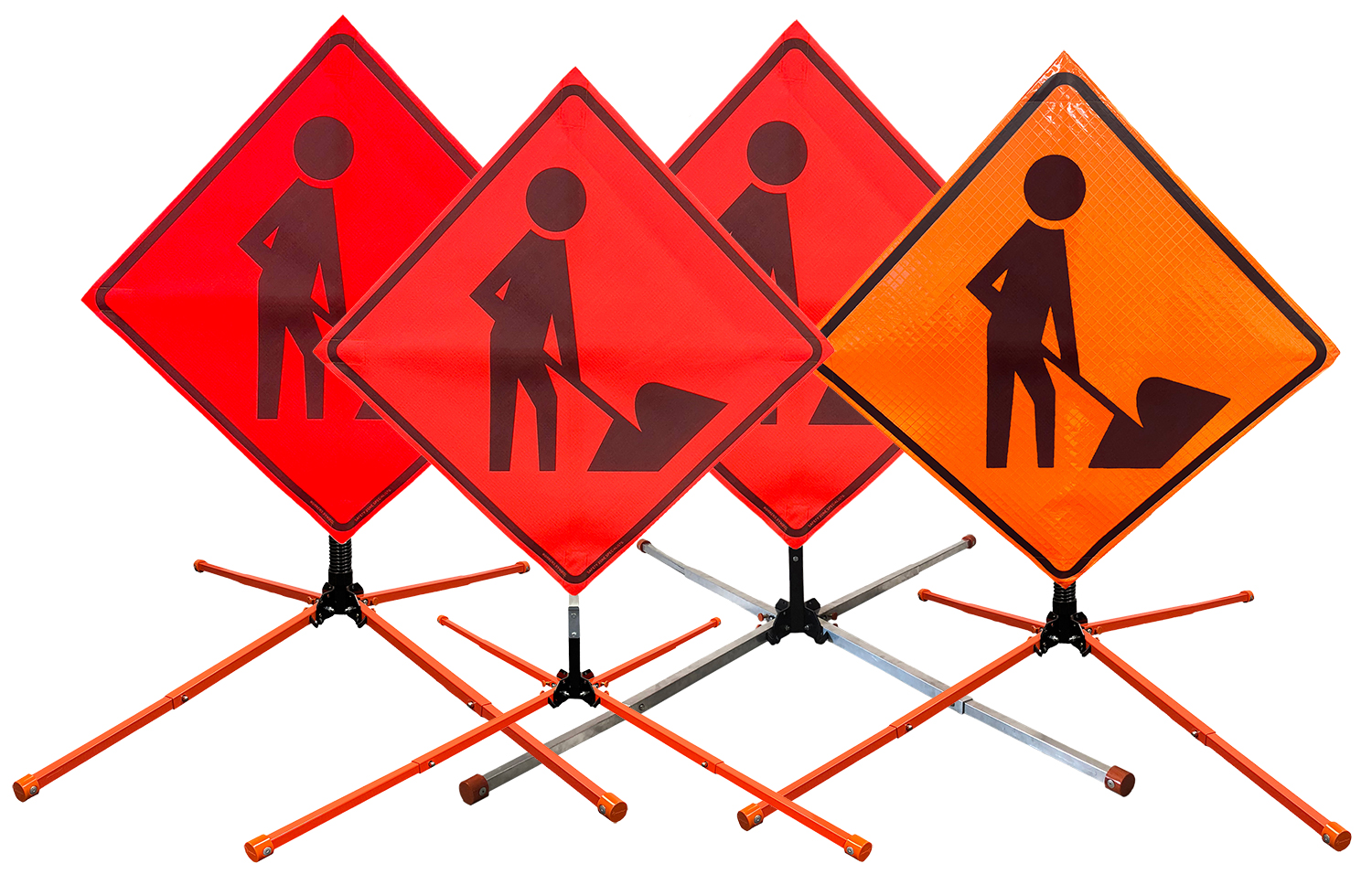 The OrangeGear® Worker Symbol Roll-Up Sign & Stand Kit includes a 36" or 48" roll-up mesh or reflective vinyl safety sign, a four-legged steel or aluminum springless or single spring steel stand, and a pair of orange fiberglass cross ribs. The mesh signs are crafted from a robust, highly visible 15oz fluorescent safety orange woven mesh, while the reflective signs are made from ASTM certified, 3M™ high intensity reflective vinyl. Both signs feature a legend that complies with MUTCD standards, ensuring visibility for both road users and pedestrians. Each sign is equipped with durable sewn-on mesh corner pockets designed to accommodate the provided cross ribs. The stands are lightweight and can be folded for convenient storage and transport. The stand is equipped with a universal screw-lock bracket designed to securely hold signs featuring either sewn or plastic corner pockets. The single spring stand contains a robust steel spring enhancing its stability by allowing the sign to sway in windy conditions. The springless stands are compatible with mesh roll-up signs measuring 36 inches and 48 inches, while the single spring stand is compatible with both mesh and vinyl roll-up signs measuring 36 inches and 48 inches. All the stands elevate the signs 12 inches above the ground for optimal display. A kick release lever enables the adjustment of each leg to stabilize the stand on uneven surfaces. Each leg can extend up to 41" and is topped with bright orange riveted caps for enhanced visibility. The stand's dimensions are 41" x 26.75" when extended, while it folds down to a compact size of 5" W x 24" H, weighing 13 lbs. for the springless aluminum, 18 lbs. for the springless steel, and 25 lbs. for the single spring steel. All the stands are MASH approved, with the signs meeting MUTCD compliance.